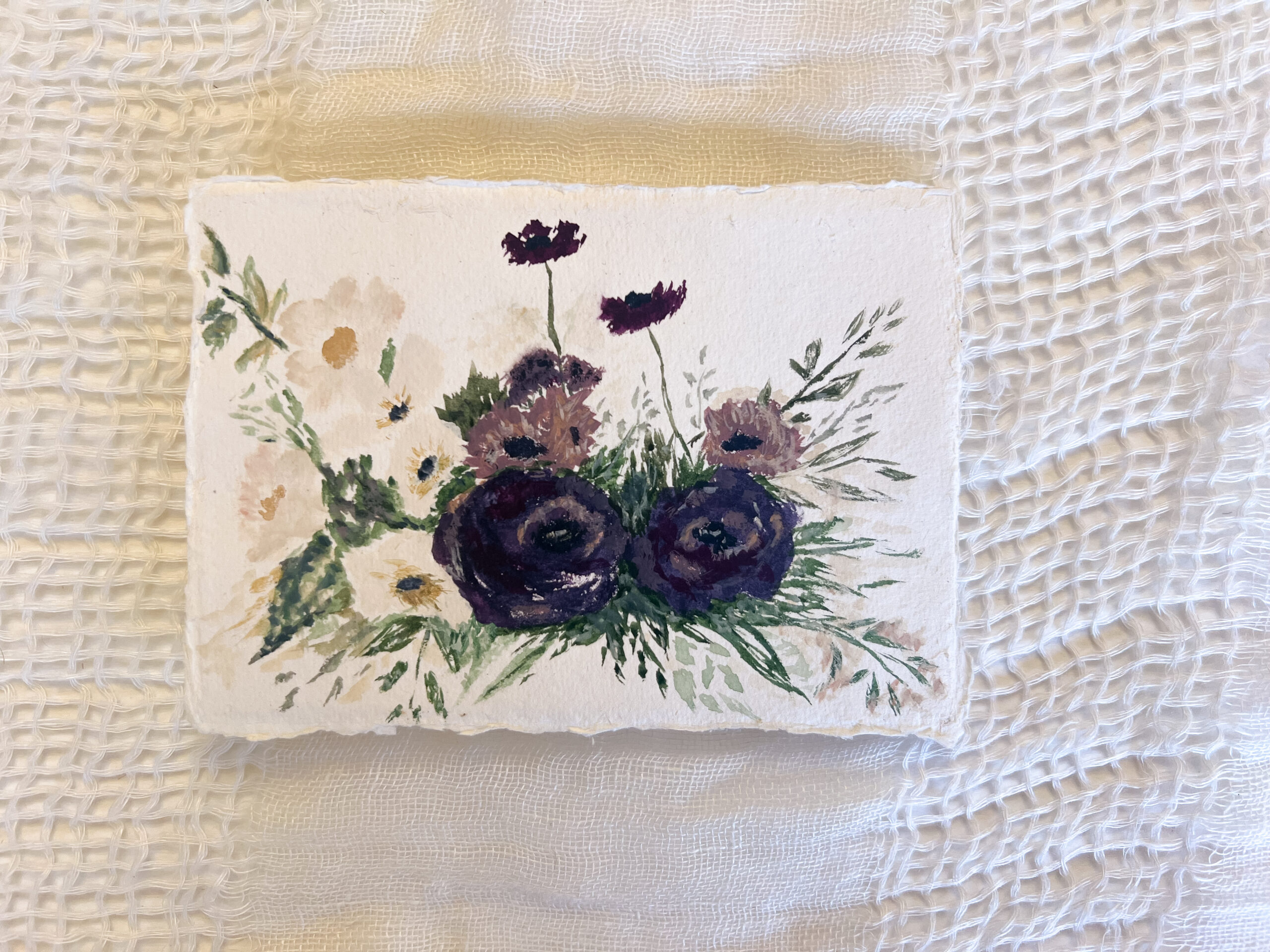 Original watercolor painted on a 4×6 handmade decked edge paper. Size may vary due to the nature of the paper.
